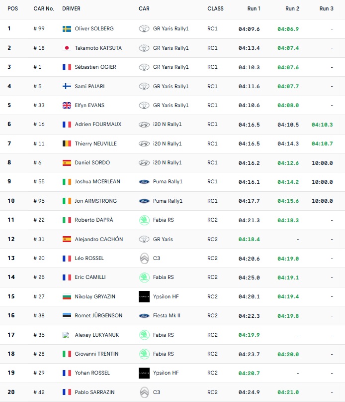 Sébastien Ogier, de regresso após falhar a etapa na Croácia, garantiu o terceiro lugar, a 0,7 segundos do topo. Solberg destacou o foco na adaptação: “Estou a tentar afinar as sensações e a trabalhar no que preciso de melhorar.” Já Katsuta elogiou a prova, classificando-a como “um dos melhores ralis de asfalto do calendário”.