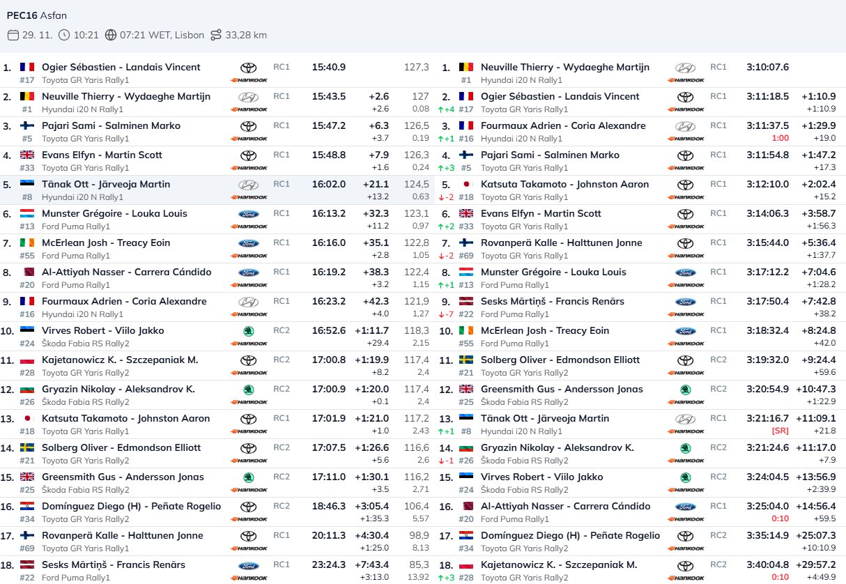 Para que Elfyn Evans (Toyota GR Yaris Rally1) fosse campeão, agora seria preciso um longo atraso de Ogier, pois até este momento, a classificação do campeonato dita que Evans está três pontos na frente de Ogier e só após a PowerStage – para não falar em verificações finais – os resultados são oficiais.