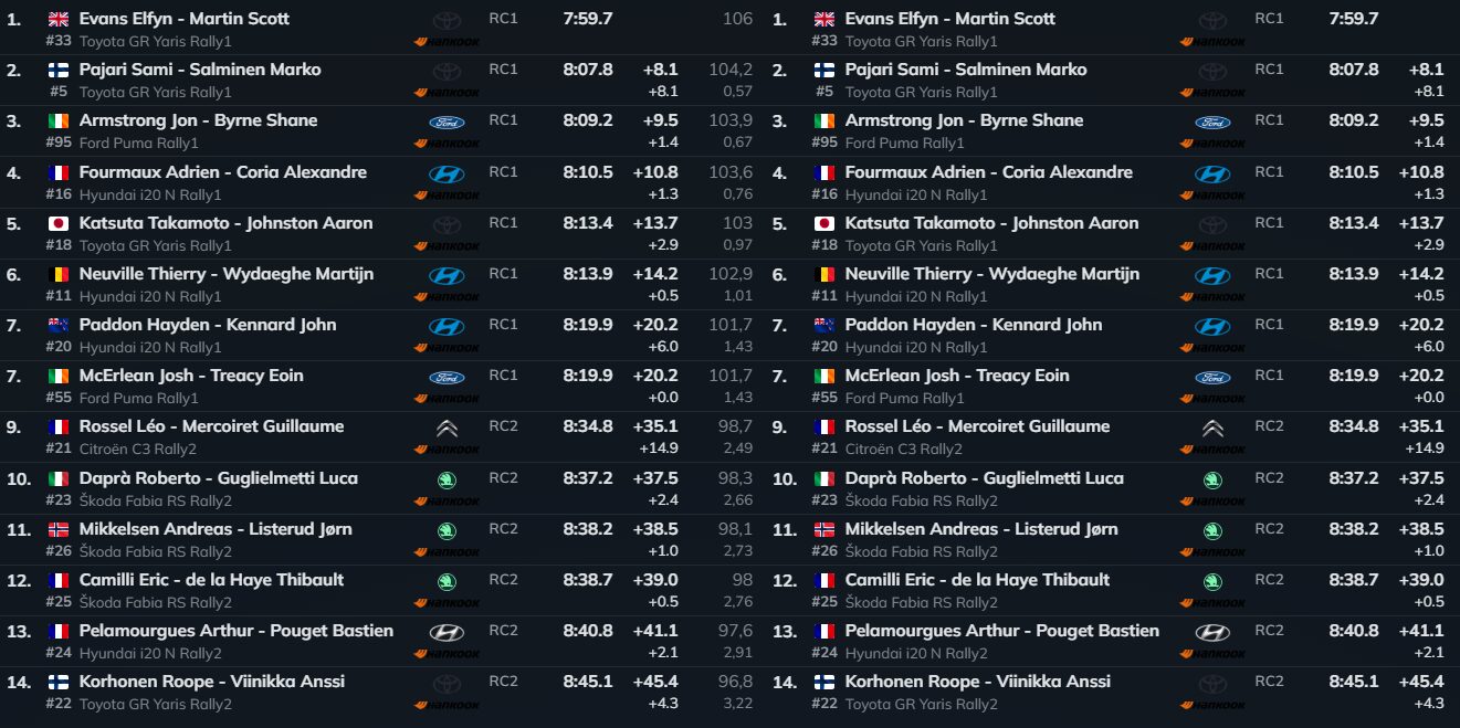 O melhor Hyundai é o de Adrien Fourmaux (Hyundai i20 N Rally1) já a 10.8s da frente seguindo-se Takamoto Katsuta (Toyota GR Yaris Rally1) a 13.7s, Thierry Neuville (Hyundai i20 N Rally1) a 14.2s, Hayden Paddon (Hyundai i20 N Rally1) a 20.2s e Joshua Mcerlean (Ford Puma Rally1) com o mesmo tempo. Margens já significativas em apenas 14.12 Km, devido ao acidente de Solberg. Todos passaram por lá, menos Evans…