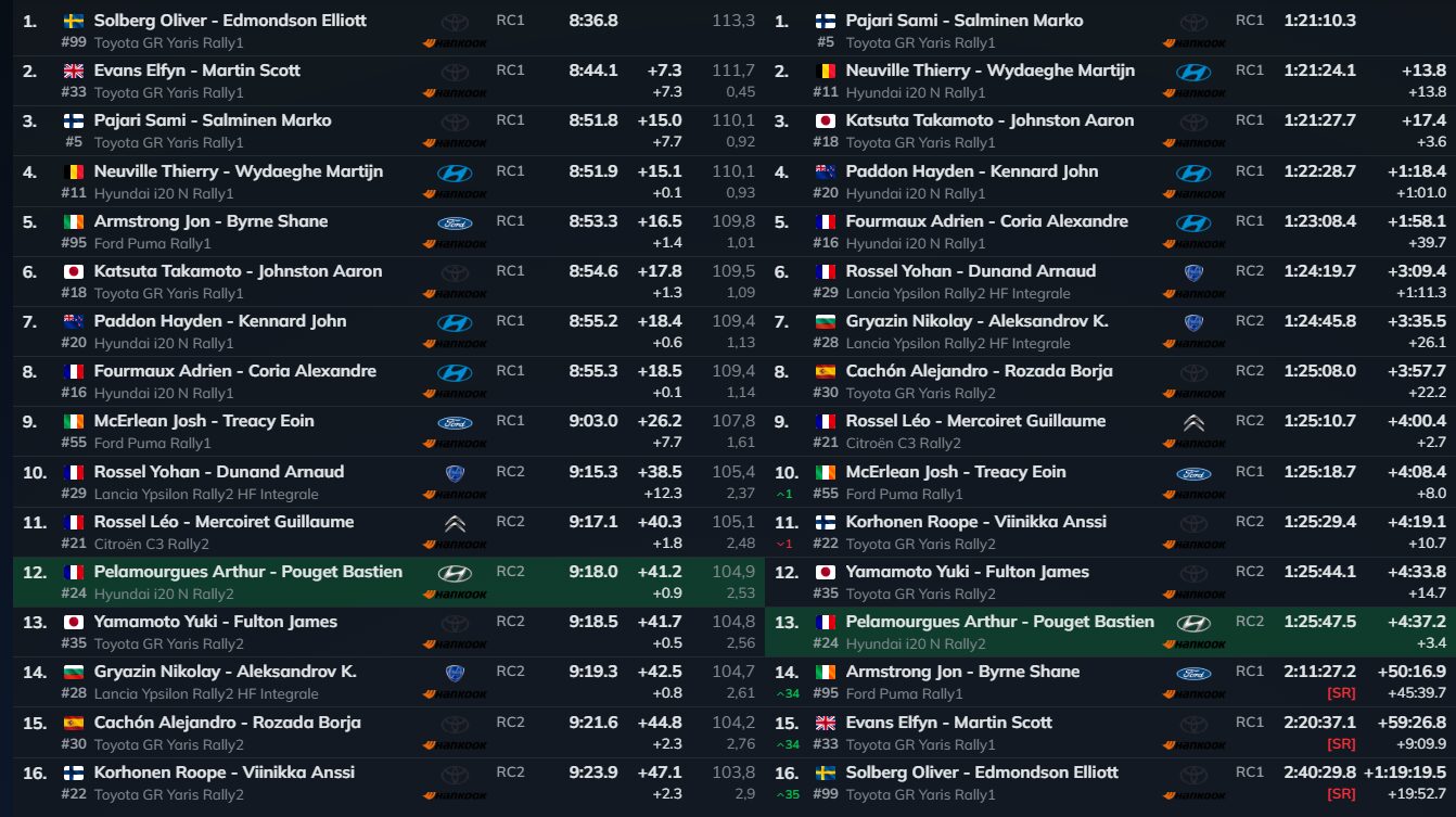 No topo da tabela, Sami Pajari ignora as armadilhas do solo e, com uma condução cirúrgica, consegue ser um décimo mais rápido que Neuville, estendendo a sua vantagem na geral para quase catorze segundos.