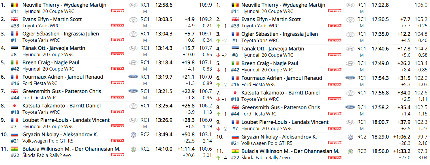 A dupla Thierry Neuville/Martijn Wydaeghe (Hyundai I20 Coupé WRC) está a começar o dia da melhor maneira, tendo liderado a SS2 e alargado as distâncias para a concorrência. Neuville tem agora 7.7 segundos de avanço sobre Elfyn Evans/Scott Martin (Toyota Yaris WRC) que subiu à segunda posição da geral. Quem começa a recuperar tempo também é Sébastien Ogier/Julien Ingrassia (Toyota Yaris WRC) que depois do furo na SS1 tentar aproximar-se do líder, enquanto Ott Tänak/Martin Järveoja (Hyundai I20 Coupé WRC) escorregou até a quarta posição.