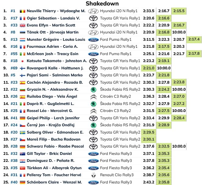 Apesar de um ligeiro susto, uma ligeira saída de estrada, com danos na carroçaria do Hyundai i20 N Rally1 após travagem tardia no primeiro cruzamento, o piloto belga recuperou e registou 2m15,5s no seu terceiro e último ensaio, batendo Sébastien Ogier por 1,1 segundos.