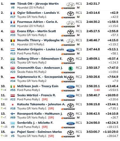 Com Ott Tänak (Hyundai I20 N Rally1) a vencer mais um troço, sete segundos na frente de Thierry Neuville (Hyundai I20 N Rally1) com Sébastien Ogier (Toyota Gr Yaris Rally1) em terceiro a 7.2s, as posições na frente mantêm-se perfeitamente estabilizadas agora com o estónio a ter 42.9s de avanço para o francês da Toyota que por sua vez tem Adrien Fourmaux (Hyundai I20 N Rally1) 1m15.6s mais atrás.