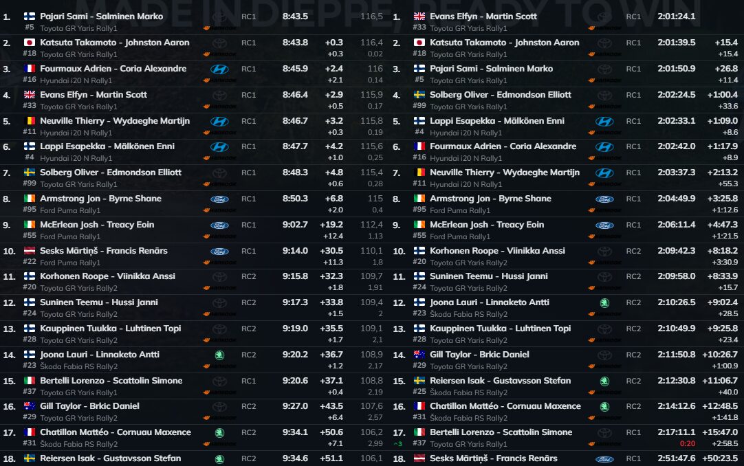 Adrien Fourmaux (Hyundai i20 N Rally1) confirma a recuperação de forma da Hyundai, Thierry Neuville (Hyundai i20 N Rally1) mistura bons tempos com dúvidas mecânicas e Jon Armstrong (Ford Puma Rally1) destaca-se novamente como o mais forte entre os M-Sport, com Joshua Mcerlean (Ford Puma Rally1) McErlean e Lorenzo Bertelli (Toyota GR Yaris Rally1) a ilustrarem o preço do erro num cenário de neve e pouca luz. Kolksele 2 fecha assim o dia de troços ‘normais’ (falta a super especial) onde a noite, o gelo e a gestão de pneus apertaram o cerco aos favoritos, mas também sublinharam a maturidade de Evans e a combatividade de Katsuta e Pajari na luta pelos lugares de honra.