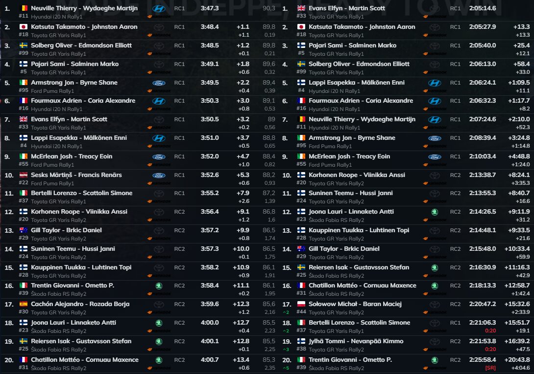 Esapekka Lappi chega pouco depois e segura o quinto lugar geral, 11,1 segundos atrás de Solberg. O finlandês é 3,7 segundos mais lento do que Neuville neste troço e admite uma certa frustração: explica que, na última especial da manhã, voltou finalmente a sentir-se “normal” no carro, a conseguir impor o seu estilo de condução, mas não consegue perceber onde perdeu tanto tempo nas classificativas da tarde, com exceção da primeira, que lhe correu bem.