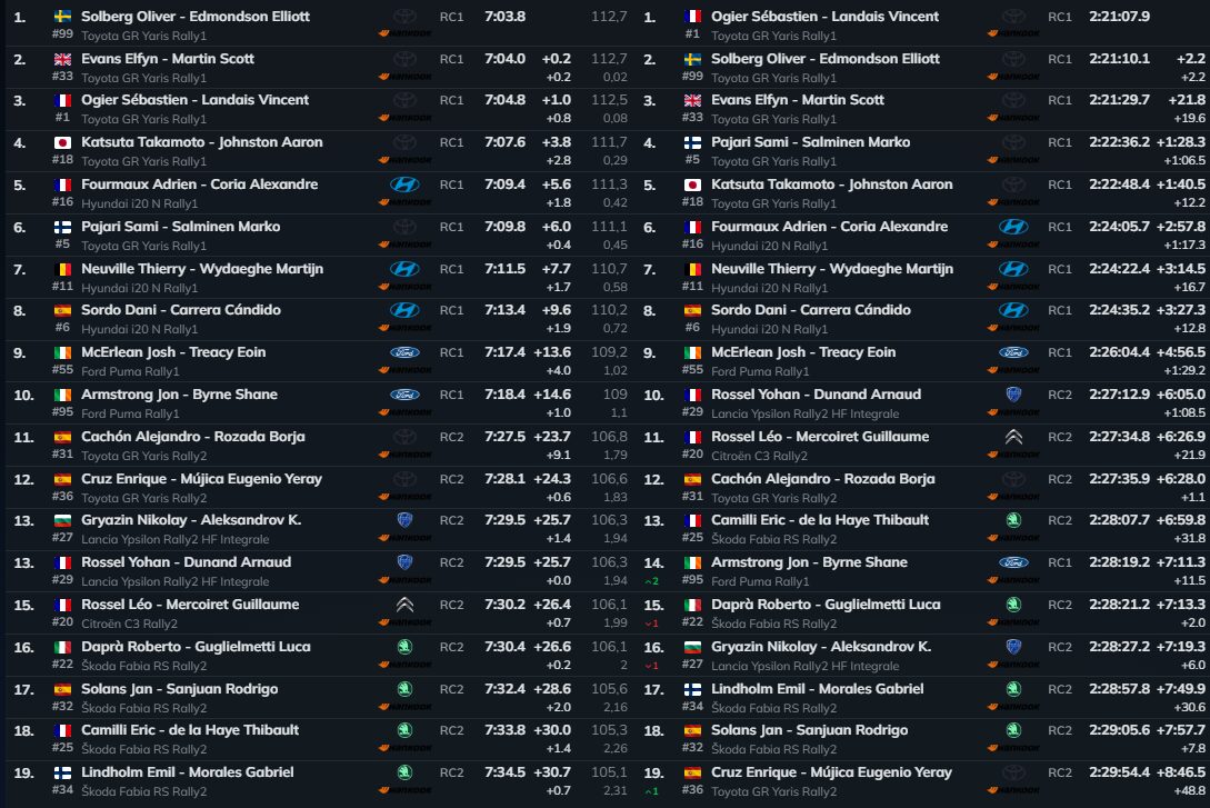 Oliver Solberg (Toyota GR Yaris Rally1) voltou a encurtar a liderança de Sébastien Ogier (Toyota GR Yaris Rally1) na segunda especial do último dia de prova, foi o mais rápido entre os homens da frente e deixou a diferença reduzida a apenas 2,2 segundos, enquanto no WRC2 Léo Rossel (Citroen C3 Rally2) resistiu ao ataque de Alejandro Cachón (Toyota GR Yaris Rally2) e segurou o segundo lugar por 1,1 segundos.
