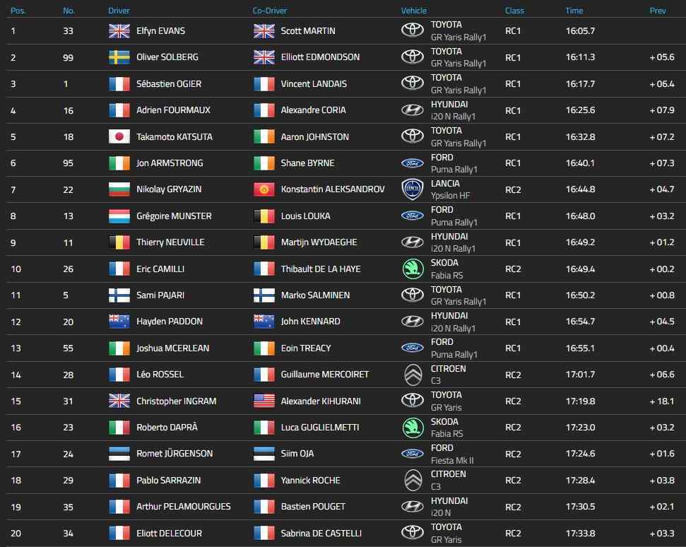 Grégoire Munster-Louis Louka (Ford Puma Rally1) cederam 42.3s, Thierry Neuville-Martijn Wydaeghe (Hyundai i20 N Rally1), sem confiança no carro, 43.5s e mais atrás, seguindo-se Eric Camilli-Thibault De La Haye (Skoda Fabia RS Rally2), Sami Pajari-Marko Salminen (Toyota GR Yaris Rally1), Hayden Paddon-John Kennard (Hyundai i20 N Rally1) e Joshua Mcerlean-Eoin Treacy (Ford Puma Rally1).