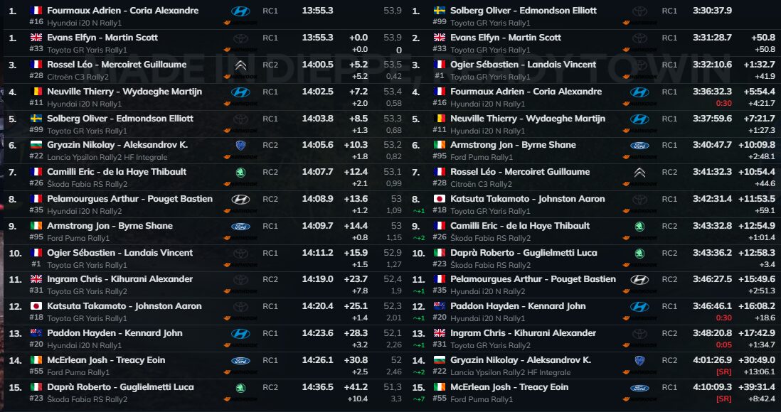 Quando os cronómetros pararam para todos, a SS14 Col de Braus / La Cabanette 1 num troço em que foi impossível andar depressa, Adrien Fourmaux (Hyundai i20 N Rally1) e Elfyn Evans (Toyota GR Yaris Rally1) dividiram o melhor tempo, Sébastien Ogier (Toyota GR Yaris Rally1) confessou não conseguir sequer “subir a colina”, Jon Armstrong (Ford Puma Rally1) surpreendeu ao ser rápido apesar de sentir que ia parado, e Oliver Solberg (Toyota GR Yaris Rally1), com o para-brisas rachado e a pressão do histórico às costas, escolheu sobreviver — perdendo alguns segundos, mas mantendo uma vantagem ainda confortável de 50,8 segundos com apenas três especiais pela frente.
