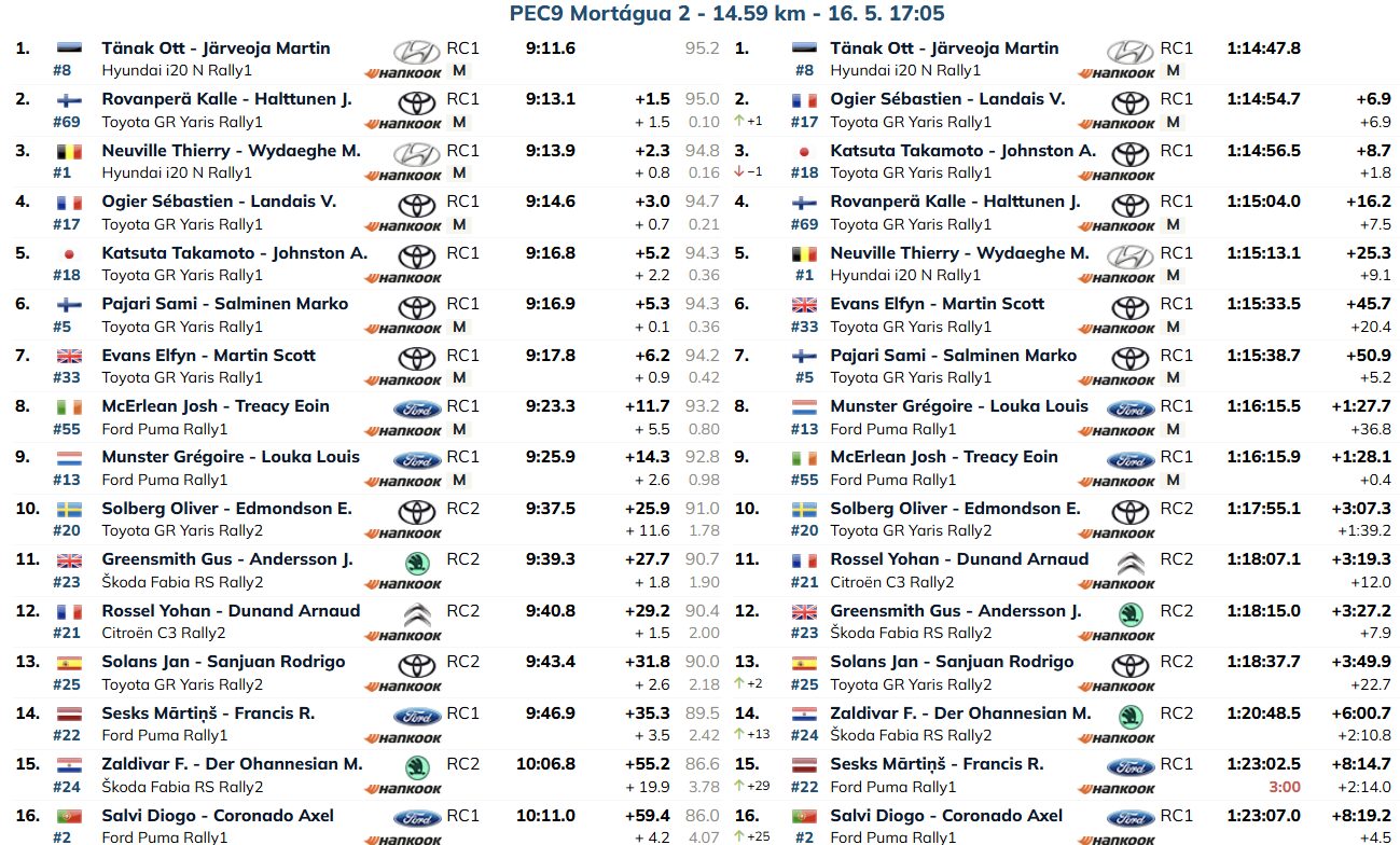 Com estes resultados, Sébastien Ogier e Vincent Landais (Toyota GR Yaris Rally1) são os novos segundos classificados, mas a 6,9 segundos de Tänak, que se mantém firmemente na liderança. Takamoto Katsuta e Aaron Johnston (Toyota GR Yaris Rally1) perderam 5,2 segundos, estando agora a 8,7 segundos da frente.