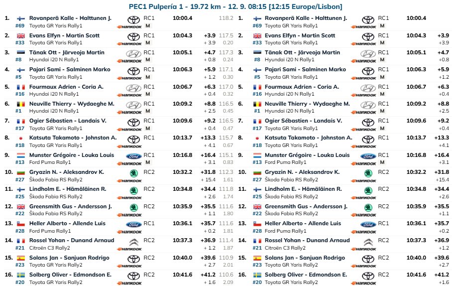 Ott Tänak e Martin Järveoja (Hyundai i20 N Rally1) terminaram em terceiro lugar, a 4.7 segundos do líder, com o piloto estónio a manifestar queixas sobre a instabilidade do seu carro. Por sua vez, Sami Pajari e Marko Salminen (Toyota GR Yaris Rally1) registaram um bom começo, alcançando o quarto tempo a 5.9 segundos da frente. Pajari admitiu que “não foi a minha melhor condução; de alguma forma, parece sempre super complicado nesta fase. Muita coisa muda, em alguns locais sente-se uma aderência muito boa e depois já não se sente o mesmo.”