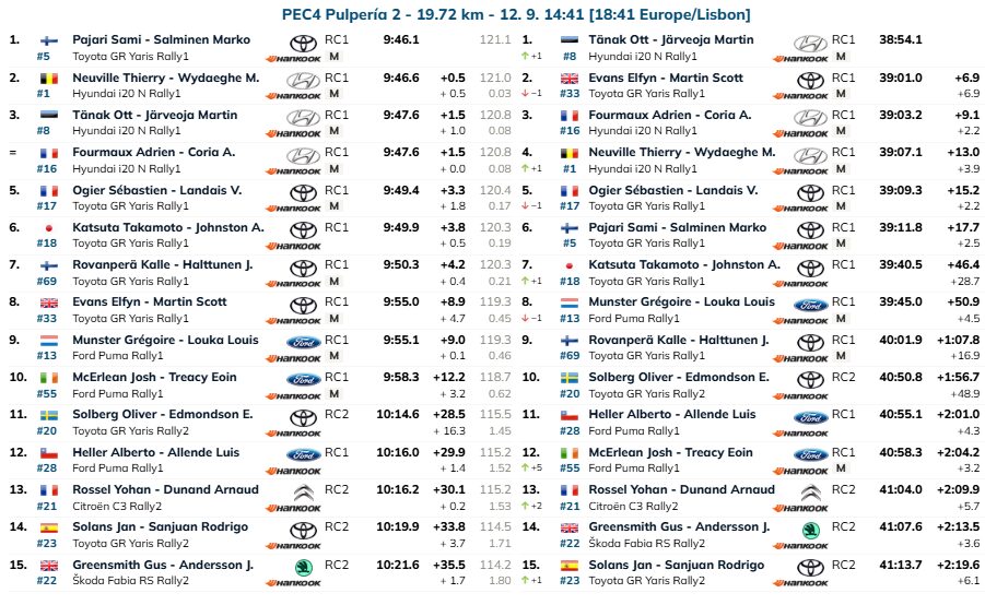 Com os troços bem mais secos do que na parte da manhã, agora, sim, a ordem na estrada está a ter efeitos significativos e por isso não foi de estranhar o triunfo de Sami Pajari e Marko Salminen (Toyota GR Yaris Rally1) na especial, com meio segundo de avanço para Thierry Neuville e Martijn Wydaeghe (Hyundai i20 N Rally1).