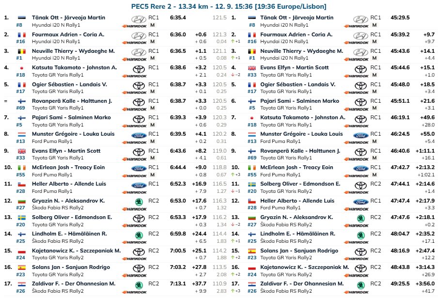 Ott Tänak (Hyundai i20 N Rally1) venceu a quinta especial, 0.6s na frente de Adrien Fourmaux (Hyundai i20 N Rally1) com Thierry Neuville (Hyundai i20 N Rally1) em terceiro a 1.1s. O melhor Toyota foi o de Takamoto Katsuta (Toyota Gr Yaris Rally1) o que significa que Elfyn Evans (Toyota GR Yaris Rally1), Sébastien Ogier (Toyota GR Yaris Rally1), Sami Pajari (Toyota GR Yaris Rally1) e Kalle Rovanperä (Toyota GR Yaris Rally1) continuam a perder tempo, com Evans a cair para quarto, para trás de mais dois Hyundai, equipa que tem agora os seus três carros na frente.