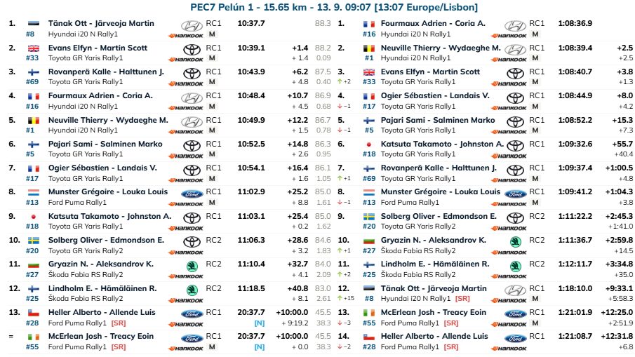 Elfyn Evans (Toyota GR Yaris Rally1) foi segundo, a 1.4s sendo que o melhor dos homens da frente foi Adrien Fourmaux (Hyundai i20 N Rally1), quarto, a 10.7s de Tanak, com Thierry Neuville (Hyundai i20 N Rally1) a ceder 12.2s e Sébastien Ogier (Toyota GR Yaris Rally1) a perder 16.4s o que significa que Fourmaux alarga a sua liderança face a Neuville, colocando-a em 1.5s e Ogier cede terreno, e está agora a 8.0s da frente, sendo passado na classificação por Evans, que é agora terceiro a 3.8s de Fourmaux.