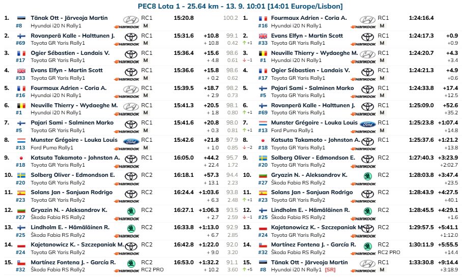 Num troço com menos chuva, mas também muita lama, Ott Tänak (Hyundai i20 N Rally1) voltou a vencer, desta feita 10.8s na frente de Kalle Rovanperä (Toyota GR Yaris Rally1). Sébastien Ogier (Toyota GR Yaris Rally1) ‘acordou’ e foi terceiro a 15.6s da frente, dois décimos na frente de Elfyn Evans (Toyota GR Yaris Rally1) com Adrien Fourmaux (Hyundai i20 N Rally1) 2.9s mais atrás e Thierry Neuville (Hyundai i20 N Rally1), mais 1.8s.