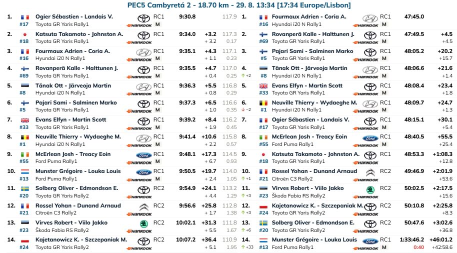 Sébastien Ogier e Vincent Landais (Toyota GR Yaris Rally1) voltaram aos triunfos em troços, mas na frente Adrien Fourmaux e Alexandre Coria (Hyundai i20 N Rally1) alegraram a margem para Kalle Rovanperä e Jonne Halttunen (Toyota GR Yaris Rally1) com os franceses a ganharem mais 0.4s.