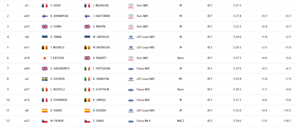 Elfyn Evans e Scott Martin, completam um top 3 100% Toyota, tendo ficado a 0.7 seg. do melhor registo. O melhor Hyundai foi o de Ott Tanak – Martin Järveoja que fez a especial “ao lado” de Ogier, tendo sido a última dupla a ir para o troço. Tanak ficou a 2.5 seg. de Ogier, queixando-se das condições de aderência: “Estava bastante escorregadio, mas estou feliz por não termos usado os pneus macios”. Já Ogier realçou que o rali começa a valer apenas amanhã: “Amanhã vai ser o verdadeiro começo. É espantoso ver tanta gente. Até agora tudo bem, mas amanhã é a sério”.
