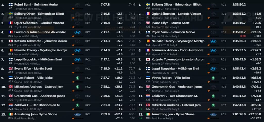 Enquanto as equipas regressam ao parque de assistência, o quadro é cristalino: Solberg continua na frente, mas com Ogier colado, a um sopro; Evans segura o terceiro lugar já a 20’.5s do líder e Pajari emerge como o homem do dia em ritmo puro. A Hyundai mantém‑se dentro da luta com Adrien Fourmaux (Hyundai i20 N Rally1) e Lappi mas Thierry Neuville (Hyundai i20 N Rally1) tenta ainda encontrar o verdadeiro passo certo.