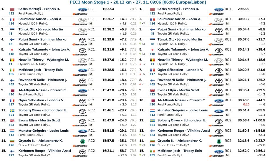 Depois de ter perdido muito pouco tempo na primeira especial, Sébastien Ogier não conseguiu repetir a proeza e foi apenas 10º, cedendo 24,4 segundos para Sesks. Elfyn Evans perdeu ainda mais tempo, 24,6s, e Kalle Rovanperä (Toyota GR Yaris Rally1) limitou melhor os danos, mas ainda assim entregou 18,4s ao líder do troço. A ordem na estrada, o piso escavado e a enorme quantidade de pedras voltaram a penalizar os primeiros a partir na estrada. As diferenças justificam-no perfeitamente.