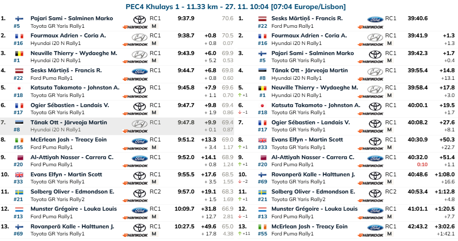 Martins Sesks, até aqui dominador, cometeu um erro no mesmo ponto em que Elfyn Evans já se tinha enganado, abrindo espaço para a primeira vitória de troço de Sami Pajari ao volante do Toyota GR Yaris Rally1. O letão foi apenas quarto, deixou mais de 6,8 segundos na zona do engano, mas manteve a liderança do rali – ainda que agora por margem mínima.