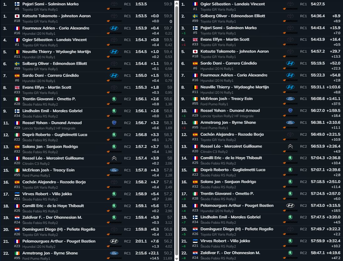 Ogier terminou o dia com o melhor tempo acumulado e uma vantagem de 8,9 segundos, construída com método e sem picos de dramatismo. Assumiu a liderança na PEC2, ao bater Oliver Solberg por 0,5 segundos, e a partir daí foi gerindo e ampliando a margem: 5,9 segundos após a PEC4, 6,4 após a PEC5, 6,6 após a PEC6, 8,6 após a PEC7 e 8,9 no final do dia.