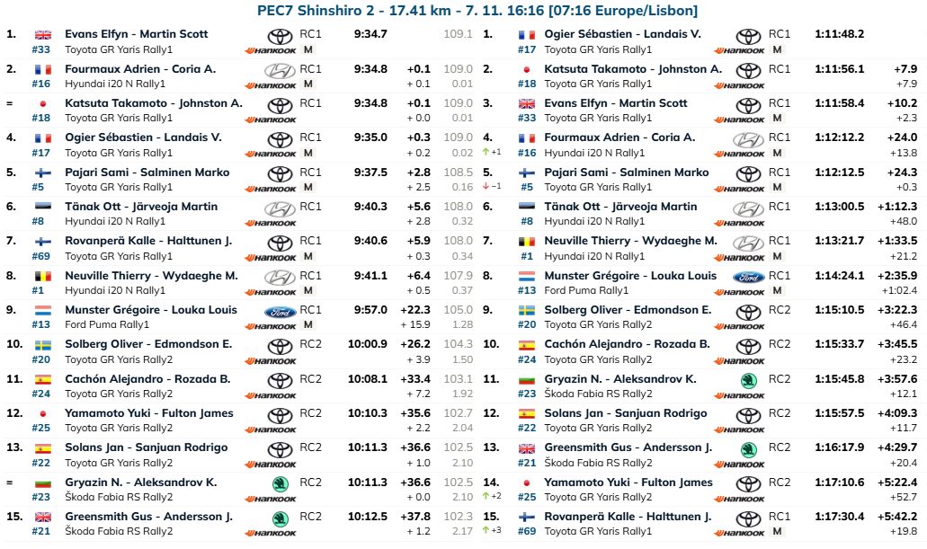 Elfyn Evans, atual líder do campeonato com 13 pontos de vantagem, não conseguiu igualar o ritmo de Ogier durante a tarde, mas conseguiu minimizar as perdas de tempo. O piloto galês venceu a última especial do dia, mas ocupa a terceira posição, atrás de Katsuta. Se o rali terminasse nesta fase, Evans teria perdido 10 dos 13 pontos de vantagem que trouxe do Rali da Europa Central.