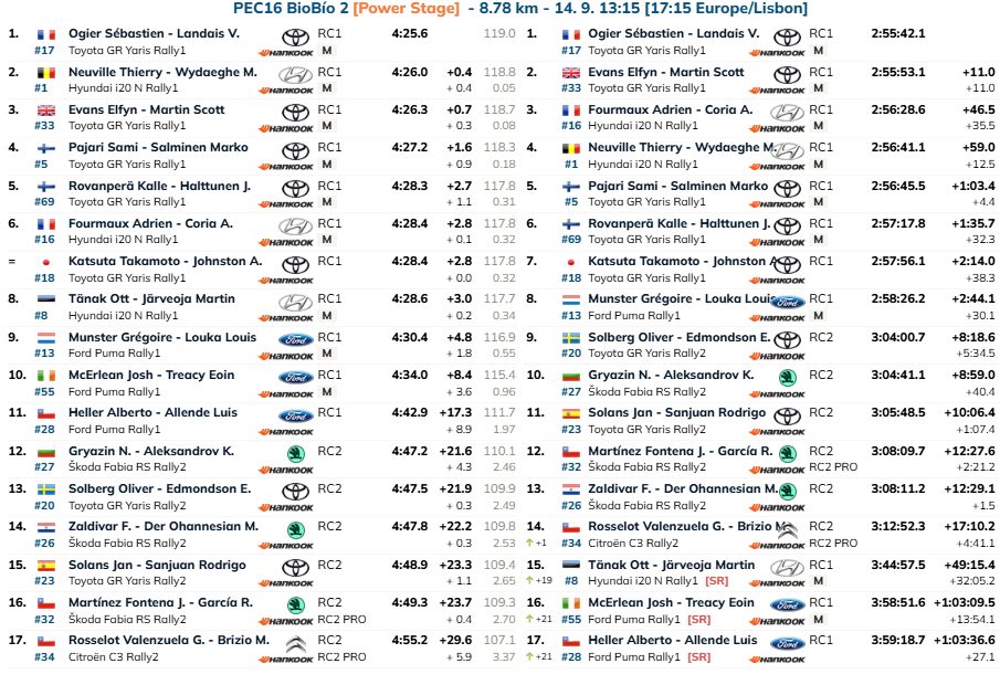 Sami Pajari (Toyota GR Yaris Rally1) foi quinto, o seu segundo melhor resultado do ano, na frente de Kalle Rovanperä (Toyota GR Yaris Rally1) que com o furo que sofreu por culpa própria se atrasou na prova e caiu para o terceiro lugar do campeonato, 21 pontos atrás de Ogier e 19 atrás de Elfyn Evans. Não é impossível, mas não vai ser nada fácil chegar ao tri.