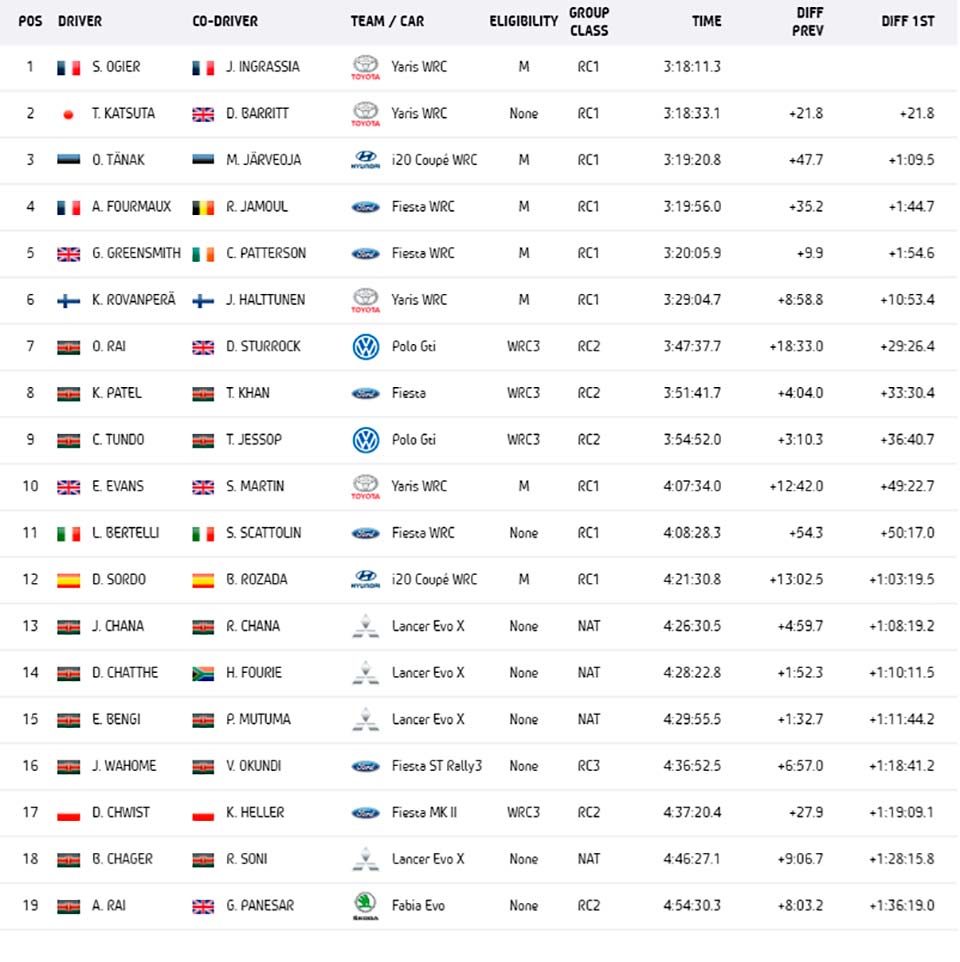 Sébastien Ogier venceu o Rali Safari, uma prova em que não sendo o mais rápido, foi o menos azarado, e contou novamente com fraca fiabilidade dos Hyundai que voltaram a ter problemas com a suspensão do i20 WRC. Takamoto Katsuta liderava perto do fim, mas o francês puxou dos galões e triunfou pela quarta vez em seis ralis. Para o japonês, este foi o seu melhor resultado de sempre.