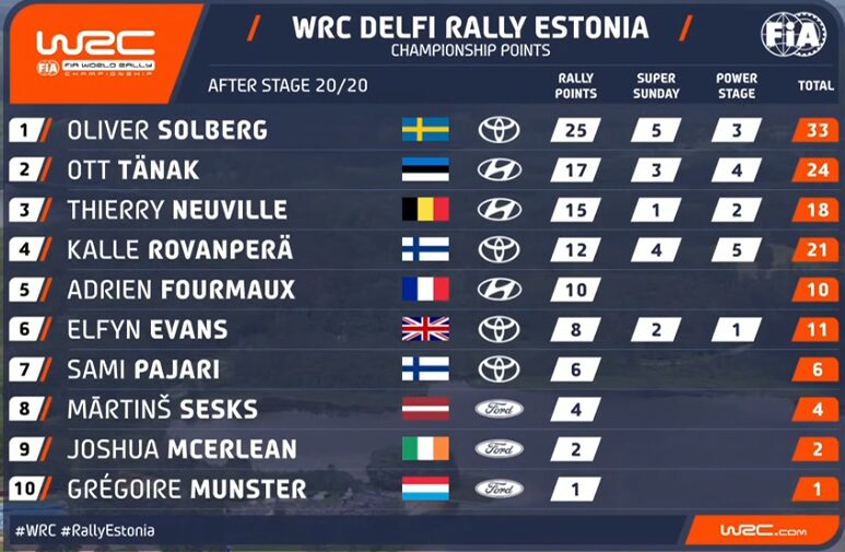 Oliver Solberg foi o piloto que mais pontuou nesta prova, 33 pontos, mas os 24 de Ott Tanak, com o segundo lugar na prova, terceiro lugar no super domingo e segundo na PowerStage, foram suficientes para passar Elfyn Evans no campeonato, pois o galês somente somou 11 pontos, pois nem no super domingo (2 pontos) ou na PowerStage, um ponto esteve bem pelo que Ott Tanak é agora o novo líder do Mundial de Ralis – Pilotos com 162 pontos, mais um do que Elfyn Evans, com o estónio a passar os dois homens da Toyota à sua frente, Evans e Séb Ogier.