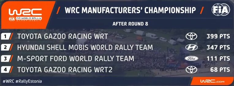 Nos Construtores, a Toyota chegou à Estónia com 65 pontos de avanço para a Hyundai e sai de lá com 52. Ainda é grande a diferença.