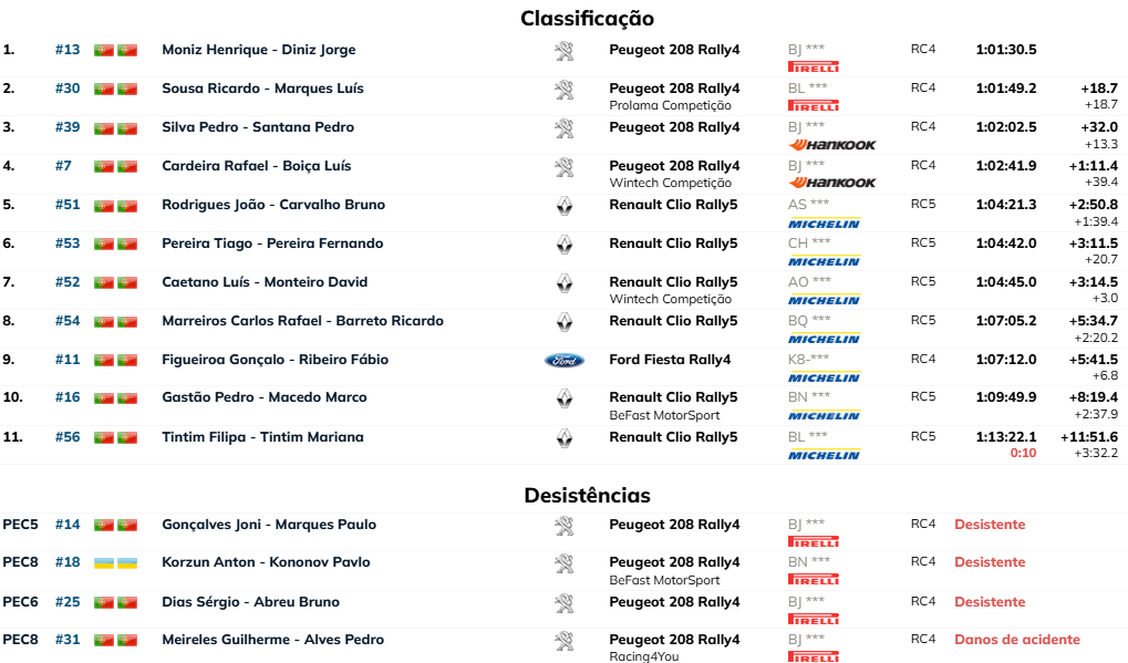 Meireles ainda tentou regressar à luta, estando a 5,9 segundos da frente apesar do acidente, mas o carro já não colaborou. Henrique Moniz venceu com 18,7 segundos de avanço face a Ricardo Sousa, que levou o carro até ao final com o maior dos cuidados e pôde, finalmente, festejar o título. O campeão terá agora oportunidade de celebrar em casa, já que o Rally de Lisboa passa literalmente à sua porta.