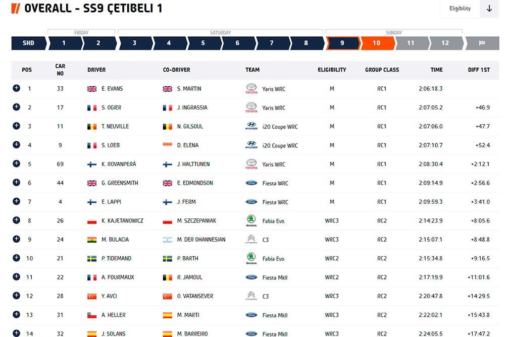 Com este conjunto incrível de percalços, a classificação foi virada de pernas para o ar, com Thierry Neuville agora em terceiro, 8 décimos atrás de Ogier enquanto Sébastien Loeb caiu para quarto a 4.7s de Ogier.