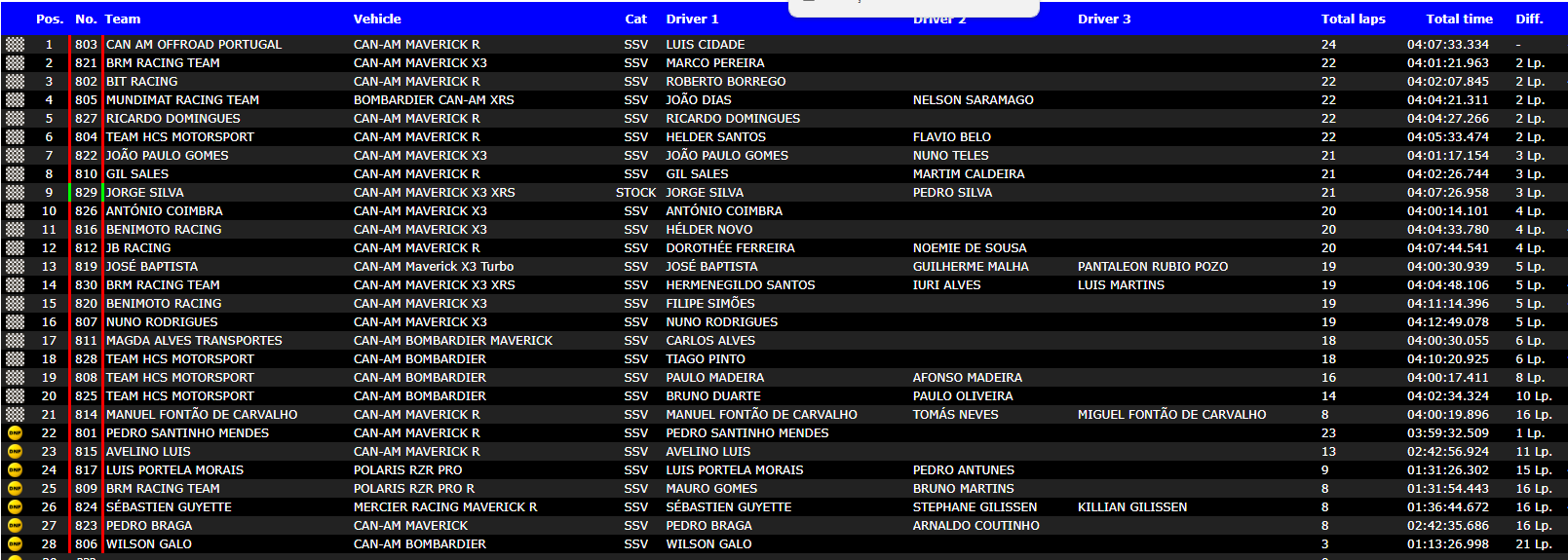 A surpresa surgiu no final da prova, com Santinho Mendes a ver-se obrigado a desistir na última volta. Iniciou a última volta a pouco mais de um minutos de distância de Luís Cidade, mas não conseguiu ver a bandeira de xadrez. Quem lucrou foi Marco Pereira (CAN-AM MAVERICK X3) a duas voltas do vencedor, com Roberto Borrego (CAN-AM MAVERICK R) a completar o pódio. A fechar o top 5 tivemos a dupla João Dias / Nelson Saramago (BOMBARDIER CAN-AM XRS) e Ricardo Domingues (CAN-AM MAVERICK R).