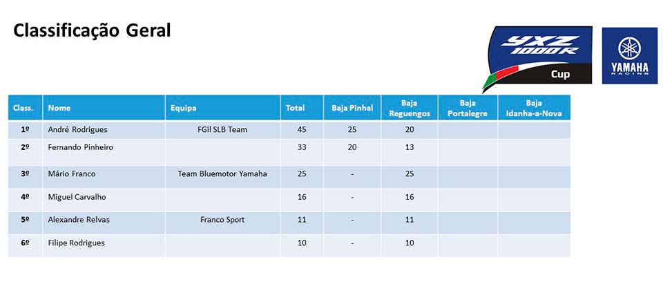 Dominada, de momento, pela dupla André Rodrigues/Ricardo Porto Nunes, a competição monomarca promovida pela Yamaha Motor Portugal será mais uma vez muito disputada com as equipas e pilotos bastante motivados para enfrentar mais uma dura competição. Por hábito a Baja Portalegre seria a etapa de consagração do grande vencedorda Taça Yamaha YXZ1000R, mas devido às condicionantes causadas pela pandemia provocada pelo Covid-19 a festa do título será adiada para a Baja de Idanha que se realiza no final do mês de novembro.