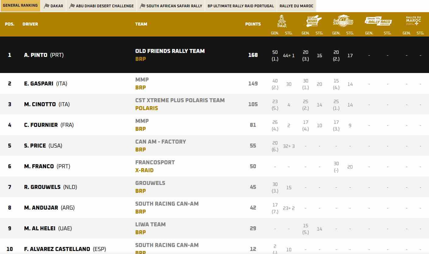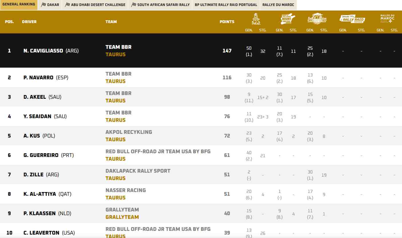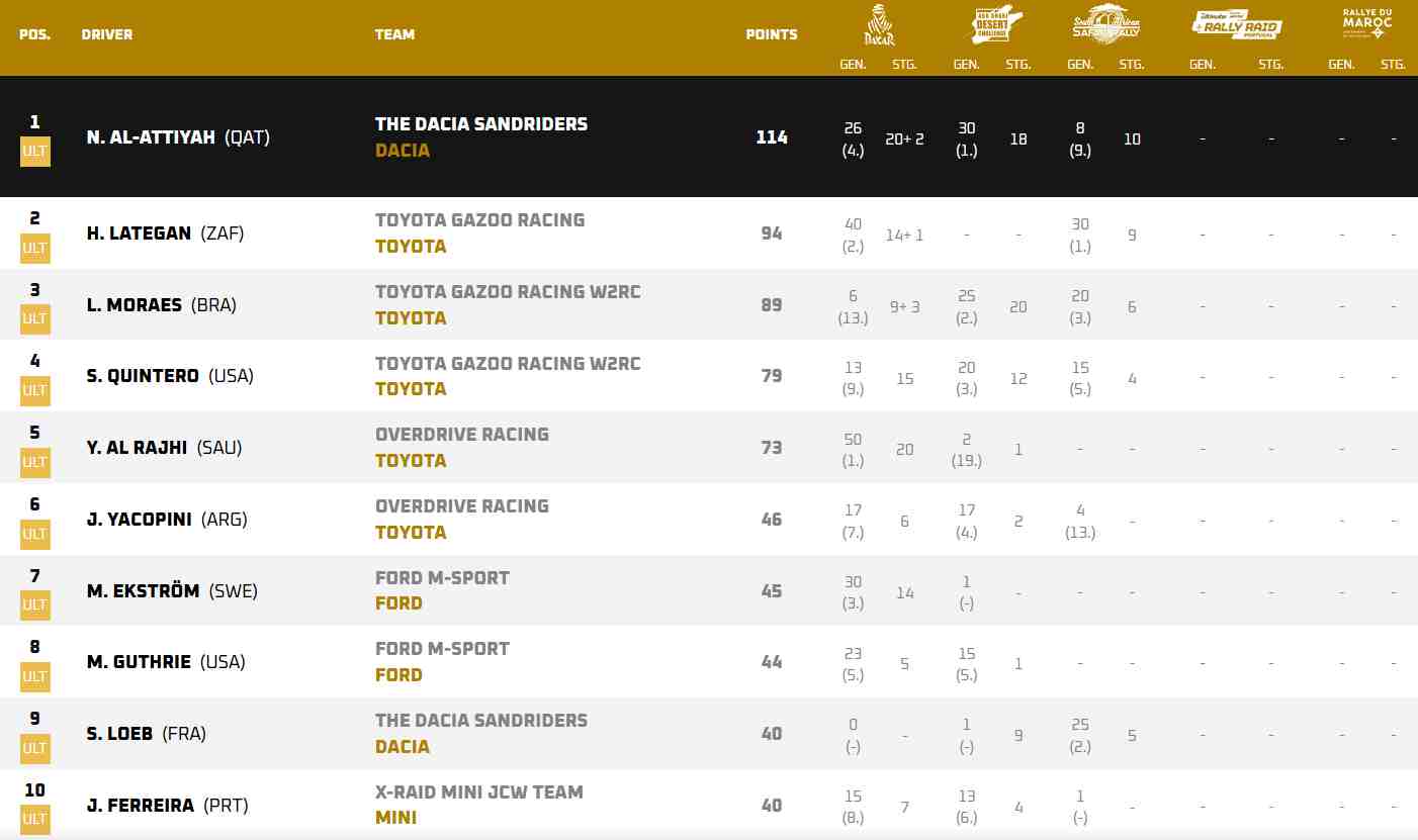 O principal perseguidor de Al-Attiyah é Henk Lategan, da Toyota Gazoo Racing, que se encontra a 20 pontos de distância. Outros nomes de peso na luta pelo pódio incluem o brasileiro Lucas Moraes e o jovem americano Seth Quintero, ambos com Toyota Hilux Evo, que, juntamente com Andrew Short, completam uma potente formação de três carros para a Toyota Gazoo Racing.
