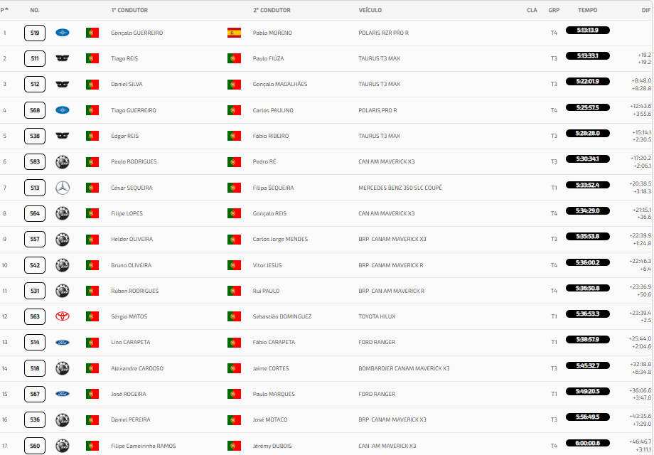 Lino Carapeta-Fábio Carapeta (Ford Ranger T1) foram terceiros mais dois minutos atrás, na frente de José Rogeira-Paulo Marques (Ford Ranger T1) e Edgar Condenso-Nuno Silva (Ford Mo EXR05 Proto T1).