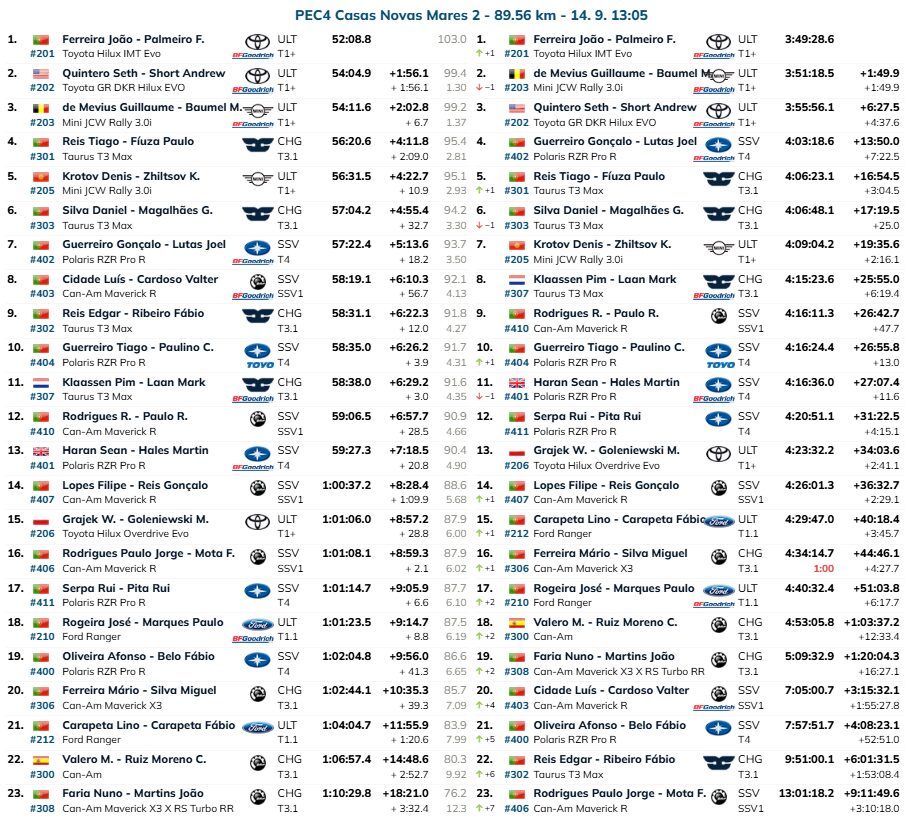 Seth Quintero-Andrew Short (Toyota Hilux) foram segundos na prova, depois de perderem quase dois minutos para os vencedores neste último Setor Seletivo, com Gonçalo Guerreiro-Joel Lutas (Polaris RZR ProR) a assegurar o quarto posto da geral, segundo do CPTT, triunfando nos SSV/T4.