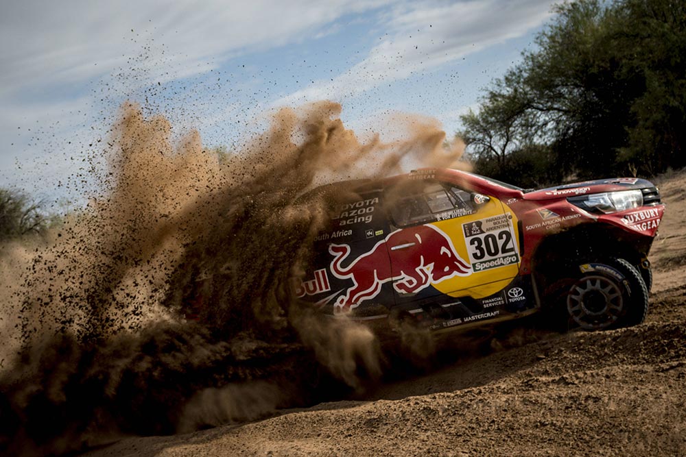 Ao contrário do que possa parecer, qualquer posição ganha no Dakar é importante e ontem houve uma batalha muito interessante de seguir entre Giniel de Villiers (Toyota) e Orlando Terranova (MINI). Os dois pilotos entraram na especial separados por menos de três minutos, a favor do sul africano, e ambos andaram muito depressa, um para tentar recuperar, ainda mais o argentino, a jogar mesmo perto de casa, Córdoba e o outro para manter a posição: “Esperávamos um grande ataque do Terranova e por isso despimos a Hilux de tudo o que pudesse ser descartado em termos de sobressalentes e isso deu resultado. Curiosamente, descobrimos que o Terranova tinha feito exatamente a mesma coisa. Corremos riscos, mas valeu a pena” disse de Villiers, agora com o quinto lugar quase garantido: “Andámos forte, mas no final só perdemos 23 segundos para o MINI. Agora ainda temos a maior parte dos dois minutos face ao Terranova, e como hoje são só 64 km penso que dá perfeitamente para manter a posição”, disse de Villiers.