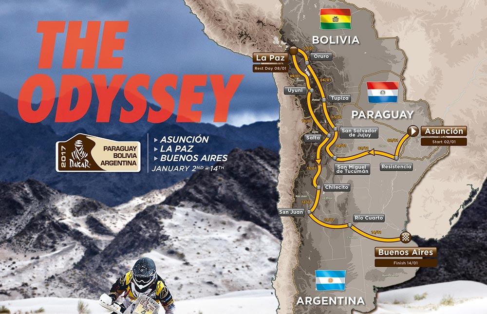 O traçado do Dakar 2017 promete ser um dos mais duros dos últimos anos. A prova que terá o seu inicio amanhã, 2 de janeiro em Assunção no Paraguai vai terminar apenas a dia 14 em Buenos Aires, na Argentina. Pelo meio pilotos e máquinas vão ter um dia de descanso em La Paz na Bolívia. Os 491 competidores e 391 veículos inscritos na edição deste ano tem pela frente a travessia de três países (Paraguai, Bolívia e Argentina) e vão percorrer cerca de 9.000 quilómetros, dos quais 4.000 vão ser ao cronómetro.