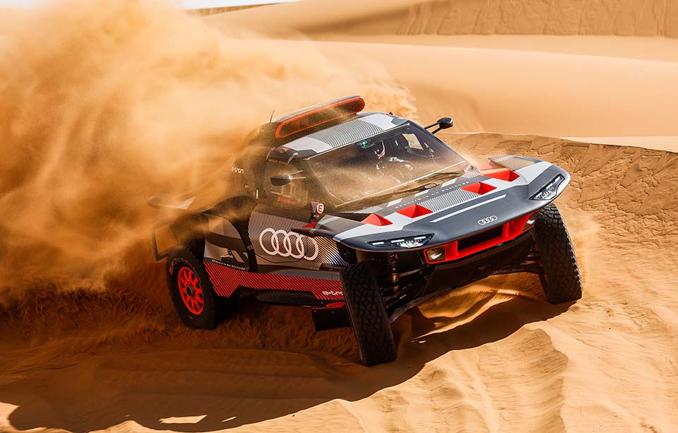 As três equipas de pilotos irão competir com uma segunda versão muito melhorada do Audi RS Q e-tron. Está homologado na categoria T1-U, que tem vindo a preparar o caminho para um futuro de baixas emissões no rali de cross-country desde 2022. A tração dos eixos dianteiro e traseiro é elétrica, com os motores elétricos a receberem a sua energia de uma bateria de alta voltagem. Um sistema de controlo revisto permite otimizar o balanço energético de vários sistemas. Um conversor de energia altamente eficiente composto por um motor turbo de quatro cilindros e uma unidade motor-gerador adicional (MGU), que funciona num ótimo intervalo de funcionamento e carrega a bateria, processa pela primeira vez os reFuels. Baseados em partes vegetais biogénicas que não competem com os alimentos, ajudam a reduzir as emissões de CO2 em mais de 60 por cento.