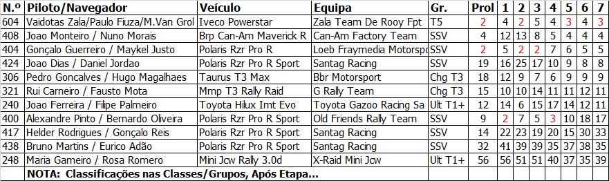 Depois dos graves problemas que tiveram Alexandre Pinto / Bernardo Oliveira (Polaris Rzr Pro R Sport/Old Friends Rally Team) foram hoje nonos na etapa, são 17º da classe, e Hélder Rodrigues / Gonçalo Reis (Polaris RZR Pro R Sport/Santag Racing) são 33º da classe. Por fim, Bruno Martins / Eurico Adão (Polaris RZR Pro R Sport/Santag Racing 35) e Maria Gameiro / Rosa Romero Mini Jcw Rally 3.0d/X-Raid Mini Jcw) são, respetivamente 35º e 39º das suas classes. Veja a tabela em baixo com a evolução das provas.