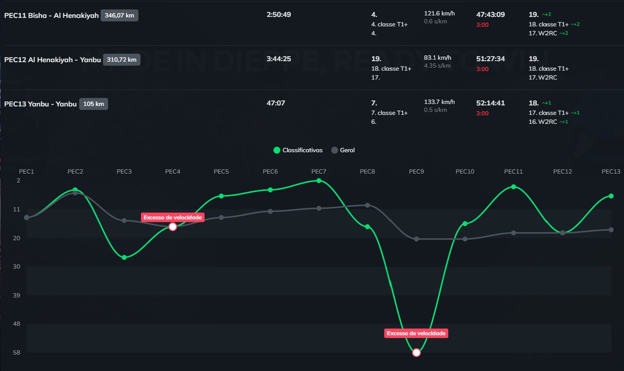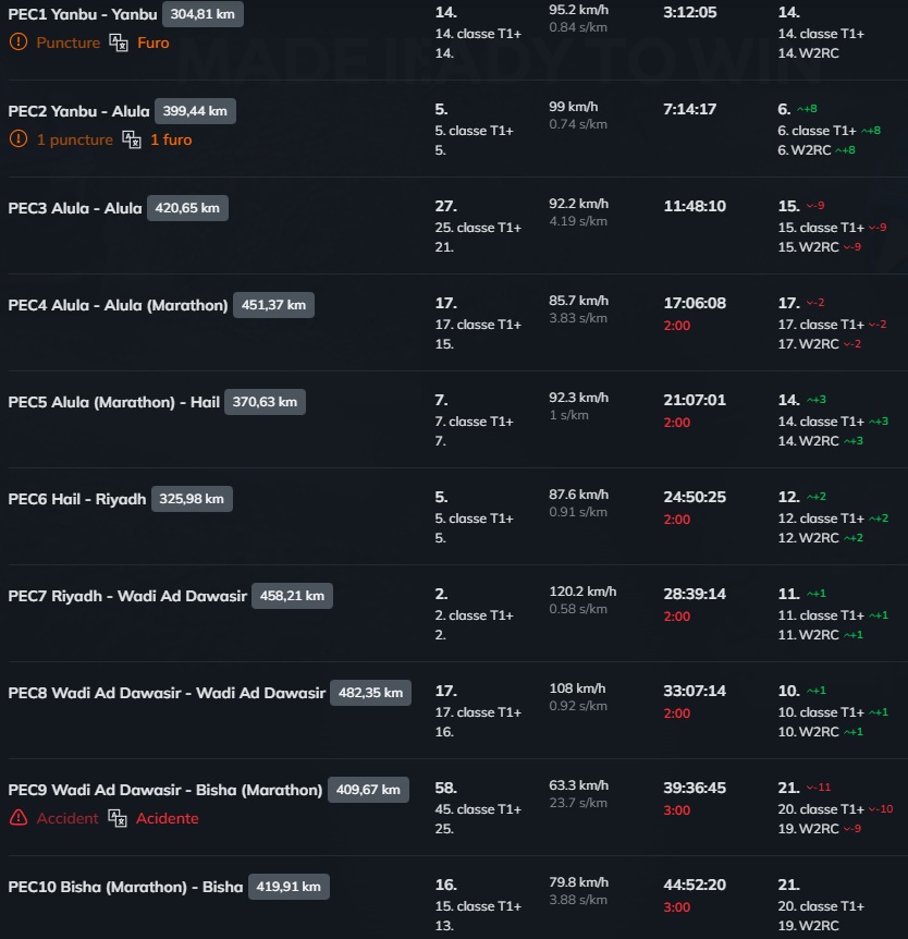 A primeira semana revelou uma dupla menos constante, mas que estabilizou. Depois, na segunda semana — particularmente as etapas 7 e 11 — demonstrou que Ferreira e Palmeiro possuem velocidade suficiente para competir pelos lugares da frente. Os furos são quase sempre uma lotaria, há quem lhes chame o castigo do terreno…
