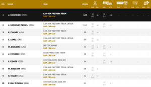 Nos SSV, João Monteiro, em representação da Can-Am Factory, fechou o “pleno” português ao vencer a corrida – só dos pilotos inscritos no Mundial, pois a prova foi ganha por Miguel Barbosa – e assumir a liderança do campeonato, confirmando o bom momento das equipas nacionais. O piloto português soma agora 123 pontos, mais 11 que o argentino Gonzalez Ferioli. A próxima prova é na Argentina, uma prova importante para João Monteiro se afirmar na classe. Luis Cidade é sétimo do campeonato, com 34 pontos.
