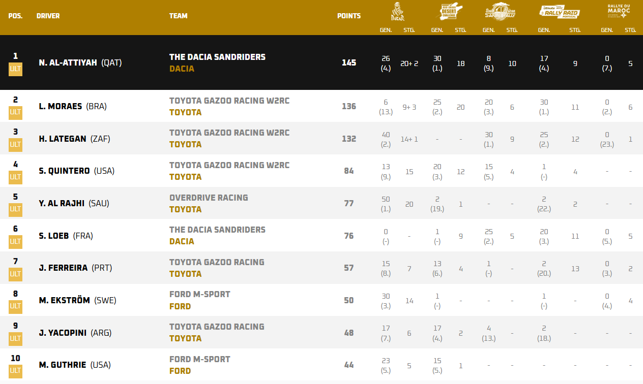 Nani Roma foi o segundo mais rápido da tirada e conquistou a liderança provisória, seguido por Lucas Moraes (Toyota Gazoo Racing), o brasileiro que continua a ser o principal rival de Al Attiyah na corrida ao título. Contudo, até aqui e apesar dos problemas iniciais de al Attiyah, só logrou ganhar um ponto a ao catari. Continuam a faltar 10 para o suplantar nas contas finais, mas ainda faltam três etapas…