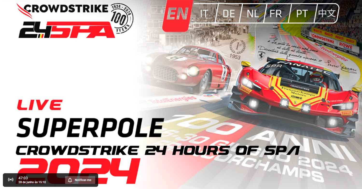 Siga LIVE a Superpole das CrowdStrike 24 Hours of Spa. Com pneus novos e pouco combustível, 20 carros lutam por um lugar na frente da grelha. Estes são os pilotos de GT mais rápidos do mundo – mas quem irá superar a concorrência e provar que é o mais rápido de todos? Veja a transmissão LIVE.