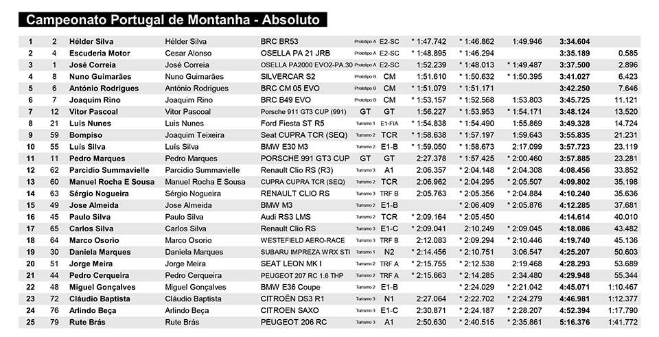 Mas na derradeira e decisiva subida o piloto de Orense não foi feliz, já que, logo ao negociar a primeira curva, teve um problema mecânico no Osella, obrigando-o a desistir quando tentava tirar Hélder Silva do ‘trono’ desta Rampa de Santa Marta. O piloto do BRC BR53 limitou-se assim a ter uma subida final de consagração, saindo assim de terras do Douro Vinhateiro como grande candidato ao título absoluto no Campeonato de Portugal de Montanha JC Group 2021.