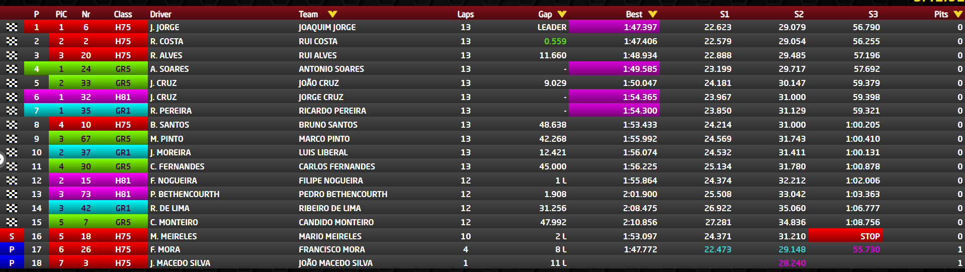 João Macedo Silva largou da pole, mas um problema no seu Porsche 911 RSR obrigou o piloto a entrar nas boxes logo na primeira volta, entregando a liderança a Joaquim Jorge. Francisco Mora era terceiro, atrás de Rui Costa. Mora atacou o segundo lugar e conseguiu passar Costa , numa luta que foi aquecendo cada vez mais até que o Porsche 911 RSR de Mora claudicou e foi obrigado a entrar nas boxes ficando o segundo lugar entregue a Costa. A corrida acalmou um pouco até a entrada do Safety Car que juntou o pelotão. No recomeço não vimos grandes mudanças mas a liderança tranquila de Joaquim Jorge passou a ser questionada por Rui Costa, com Rui Alves a ficar para trás. As posições mantiveram-se até ao fim, com vitória à geral e nos H75 para Joaquim Jorge, seguido de Rui Costa e Rui Alves no pódio.