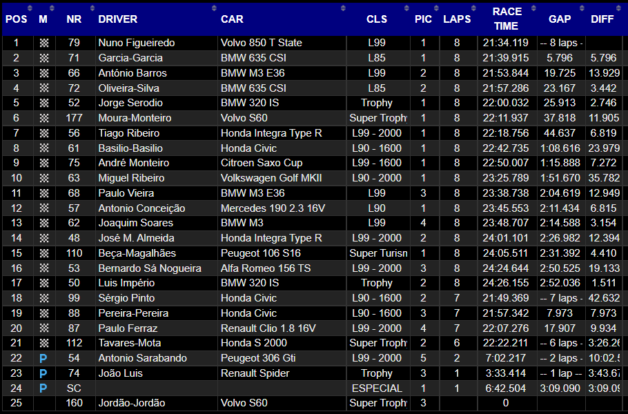 O BMW 635 CSI de Pedro Oliveira e Paulo Silva venceu em L85, Jorge Serôdio (BMW 30 IS) venceu na categoria Trophy, e Filipe Monteiro venceu nos Super Trophy. Tiago Ribeiro venceu em L99-2000, o Honda Civic da dupla Marco Basílio e Nuno Basílio venceu em L99-1600 e o Peugeot 106 S16 da dupla Arlindo Beça e José Magalhães venceu em Super Turismo