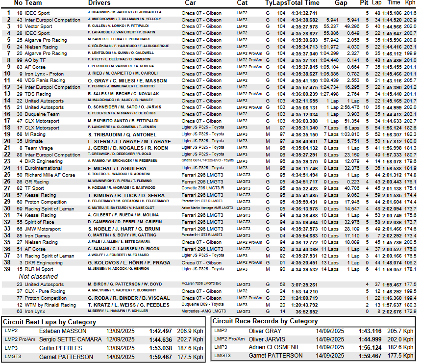 Na categoria LMP3, o Ligier-Toyota n.º 17 da CLX Motorsport, com Paul Lanchère, Adrien Closmenil e Theodor Jensen, garantiu a quarta vitória da época em condições complicadas. O triunfo permitiu à equipa assegurar, com uma prova de antecedência, tanto o título de equipas como o de pilotos.
