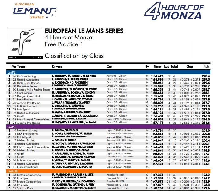 Na primeira sessão de treinos livres para as 4h de Monza do European Le Mans Series (ELMS), a dupla Filipe Albuquerque/Phil Hanson colocaram o #22 Oreca 07 – Gibson da United Autosports na segunda posição, a 0.378s do tempo mais rápido (1:34.612s) que foi postado pelo #26 da G-Drive Racing de R. Rusinov, M. Jensen e N. de Vries.