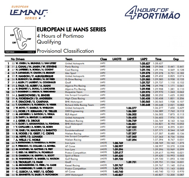 Na qualificação para a corrida das 4h de Portimão da European Le Mans Series o #32 da United Autosports, com Will Owen, Alex Brundle e Job van Uitert ao volante, conquistou a pole position no Autódromo Internacional do Algarve, com um tempo de 1:28.627s.